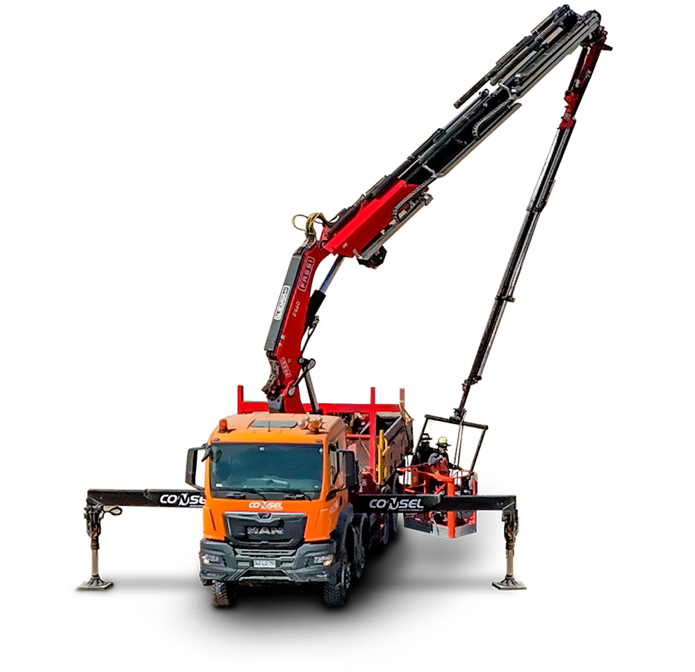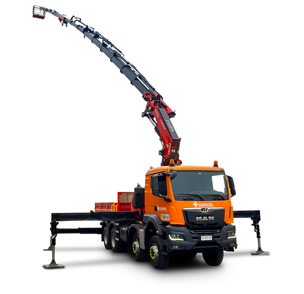 Flota especializada de camiones pluma diseñada para atender las necesidades del sector eléctrico, cumpliendo con los más altos estándares de seguridad, eficiencia y contabilidad en terreno.